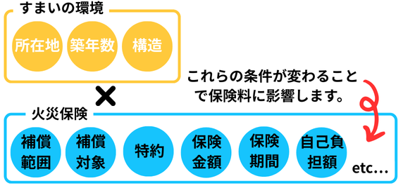 火災保険の保険料は、ご自身の住まいの環境における「物件所在地」「構造」「築年数」と、火災保険契約時に選択する「保険の対象(建物or家財or両方)」「補償範囲(契約プラン)」「付保内容(特約など)」「保険金額」「保険期間」「自己負担額」などがかけ合わさって決まります。