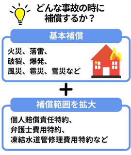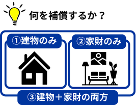 火災保険を選ぶ際には、主に①補償対象=何に火災保険をかけたいか、②補償範囲=どんな事故の時に補償したいか、③補償内容がきまったら最後は各社を比較・検討することで今の住まいのぴったりな火災保険が見つかります。